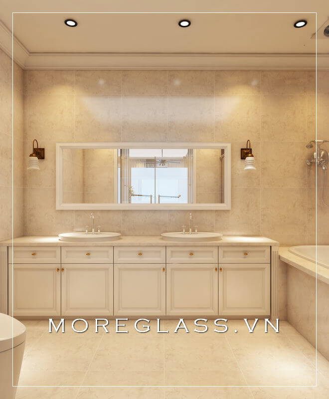 Hệ thống kính ngăn hiện đại được sử dụng trong không gian phòng tắm rộng của biệt thự, nhà phố thêm hiện đại, tiện nghi.