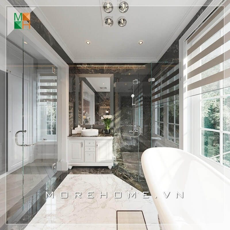 Thiết kế phòng tắm đơn giản nhưng sang trọng và tiện nghi với nội thất hiện đại ở một không gian thoáng đãng của biệt thự, nhà phố