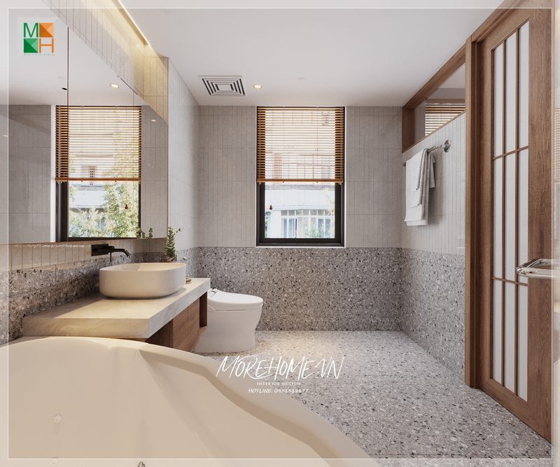 Thiết kế nội thất phòng tắm biệt thự, nhà phố sáng tạo, sử dụng gạch ốp tường và gạch lát sàn màu sắc hài hòa tạo nên một không gian phòng tắm cảm giác thêm rộng và sang trọng.