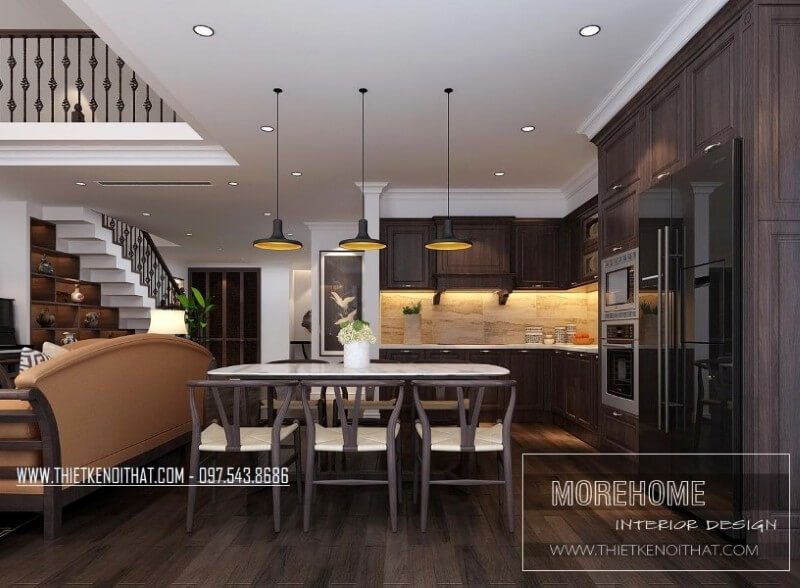 Liền kề là phòng khách sang trọng là không gian phòng ăn ấm cúng kết hợp phòng bếp giúp cơi nới không gian thêm rộng hơn, giúp cho cả gia đình luôn có cảm giác ấm áp quây quần bên nhau