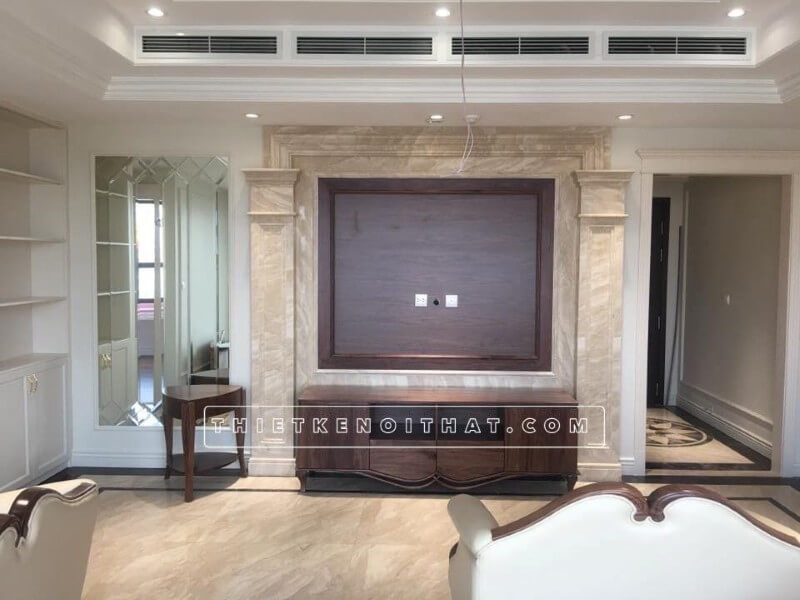Thi công hoàn thiện sản phẩm nội thất kệ tivi phòng khách chung cư gỗ tự nhiên phong cách tân cổ điển tại Vinhomes Nguyễn Chí Thanh Hà Nội