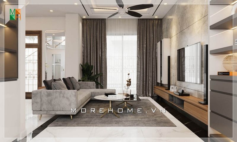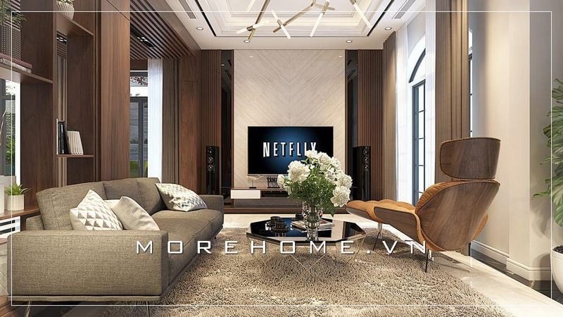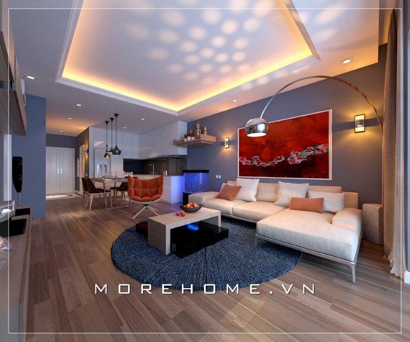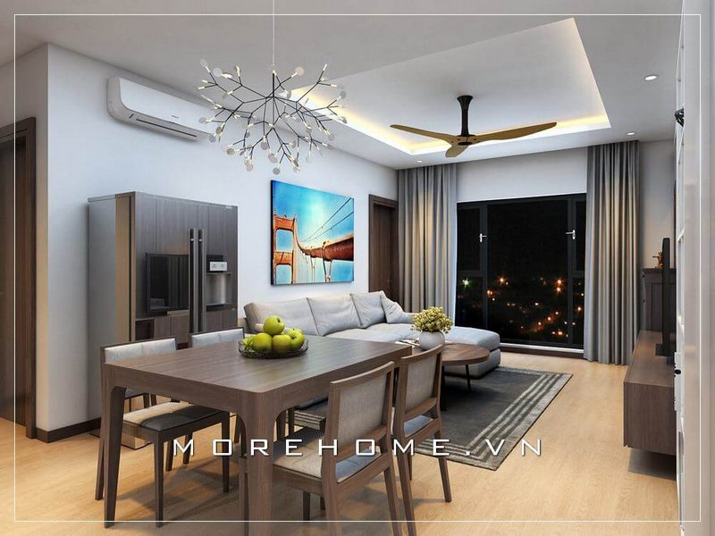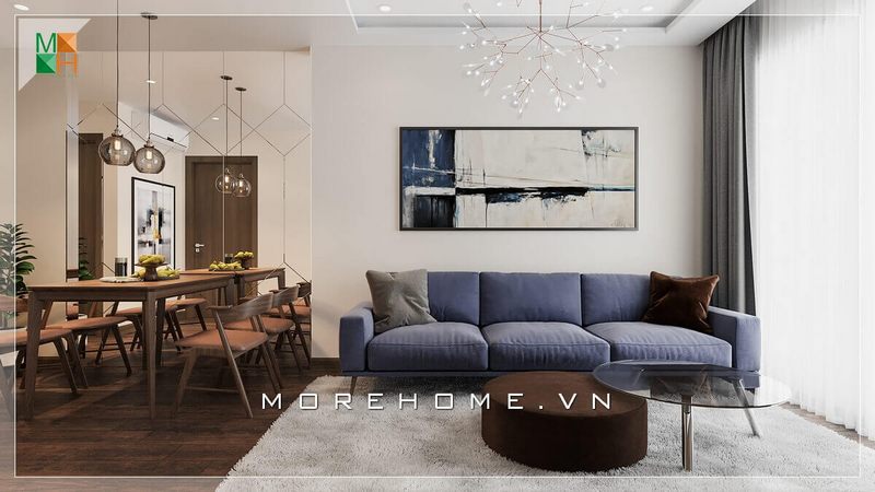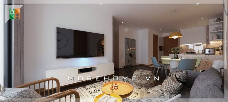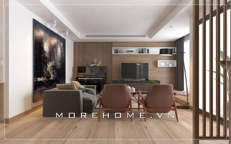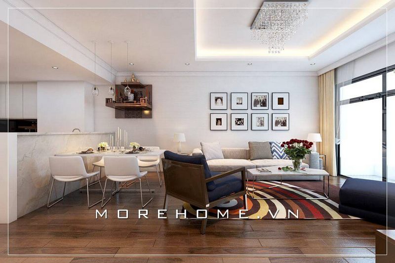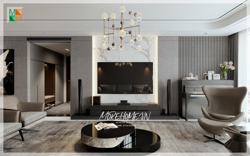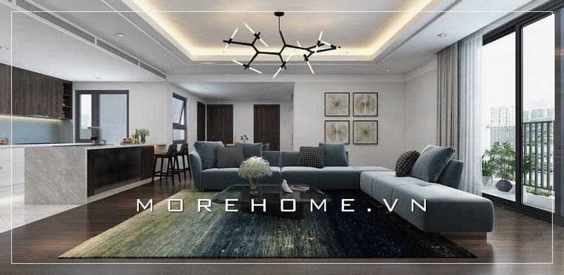 Phòng khách với phong cách chung cư hiện đại là 1 xu hướng được nhiều người hướng tới. Được thi công hoàn thiện từ bản vẽ thiết kế của các kiến trúc sư Morehome với sự sắp đặt này không gian phòng khách vừa đầy đủ để đảm bảo việc tiếp khách nhưng cũng mang tính thẩm mĩ cao.