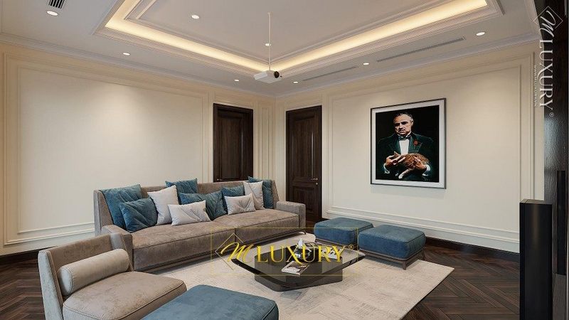 Mẫu thiết kế nội thất biệt thự cao cấp, nổi bật với bộ sofa bọc nỉ tân cổ điển sang trọng, đẳng cấp