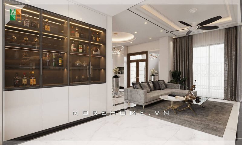 Thiết kế tủ rượu biệt thự âm tường mang phong cách tân cổ điển, bàn ghế trong phòng rượu chất liệu chính được sử dụng là gỗ tự nhiên cao cấp tạo nên vẻ sang trọng hiện đại đồng thời mang lại cảm giác ấm cúng cho phòng khách của gia chủ.