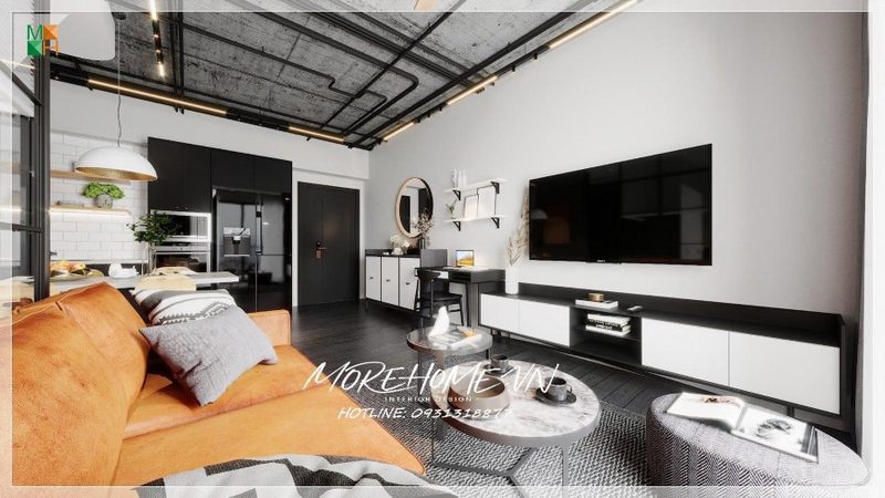 Thiết kế phòng khách đẹp kết hợp các thiết bị điện tử thiết yếu được bố trí một cách khoa học và thống nhất mang lại không gian tiện nghi mà vẫn mang nét trẻ trung, hiện đại, cá tính cho căn hộ.