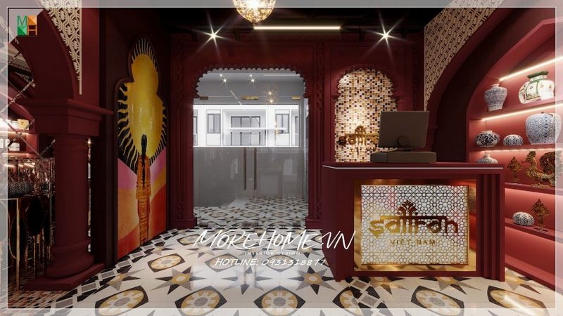 Đặt 1 chiếc bàn hình chữ nhật trang trí tối giản kết hợp giữa màu tím và mặt kính trong suốt làm tôn nên tên thương hiệu Showroom dược phẩm Saffron tại quầy lễ tân, bên cạnh đó mặt tường khá độc đáo được tạo nên từ các mặt đá 1 tác phẩm kết hợp về trí óc và nhân lực.