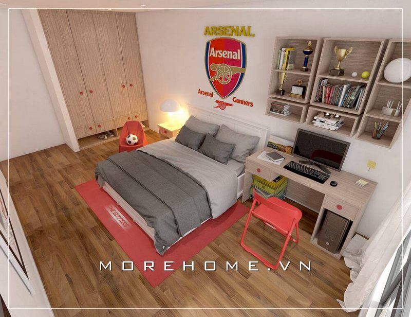 Phòng ngủ của bé trai cá tính và năng động được trang bị nội thất đơn giản, hiện đại nhưng không quá rườm rà. Chi tiết như chiếc ghế và thảm trải màu đỏ đã tạo nên một điểm nhấn cho căn phòng.